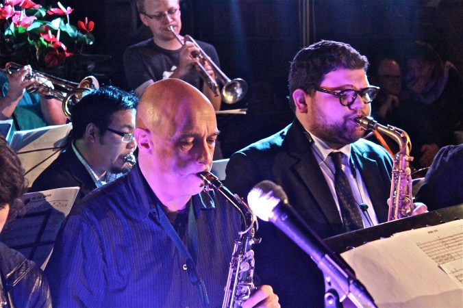 I love Jazz big bands and couldn’t have been more pleased when Roger engaged the AJO to play on awards night. It is more than possible that I had dropped a hint. Nothing underscores an occasion like a Jazz orchestra and having a 17 piece band in an intimate space is the best of listening experiences. Those surges of raw power always please, but it is something else that I look for. It is their collective agility , the tension and release and the quality of their ensemble playing. This is quickly revealed if the charts are well written, and they were.