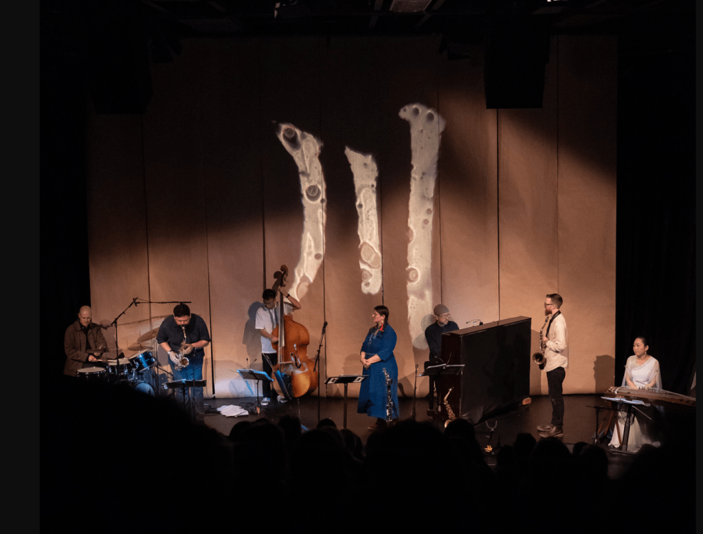 The musicians are from Wellington and Auckland. Chelsea Prastiti (voice), Jia Ling, (guzheng), Jake Baxendale (compositions, alto, tenor & baritone saxophones, clarinet & bass clarinet), Callum Passells (sopranino & alto saxophones), Daniel Hayles (piano & vibraphone), Johnny Lawrence (double bass), Cory Champion (drums & effects), Louisa Williamson (flute tk 2), Ben Hunt (trumpet tk 5), Kaito Walley (trombone tks 2 & 5), J Y Lee (flute tk 10), Millie Mannins (oboe tk 10) – btw how nice to see Roger Manins daughter in this lineup.