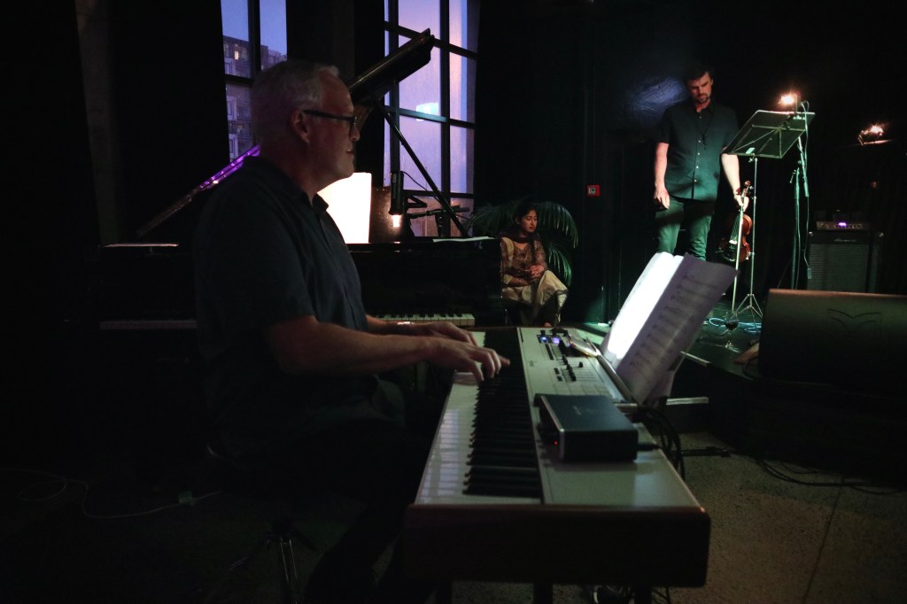 While both musicians contributed tunes, the majority were from Choi. I was so engaged that I failed to notice that I had not switched on the external camera mic. The absence of the small green light dawned on me just before the end of the gig and the tune that I most wanted to post is recorded as a well-choreographed silent movie. The tune in question was titled ‘Playground Song’ (Choi) and it swung softly like a Carla Bley/Swallow tune. You will have to take my word for that, but it really did. There is an EP or an LP waiting to happen here, and I hope that they record this material. I captured only one tune, the second to last tune. It is an arrangement of a tune that Choi wrote for her Indie pop group.