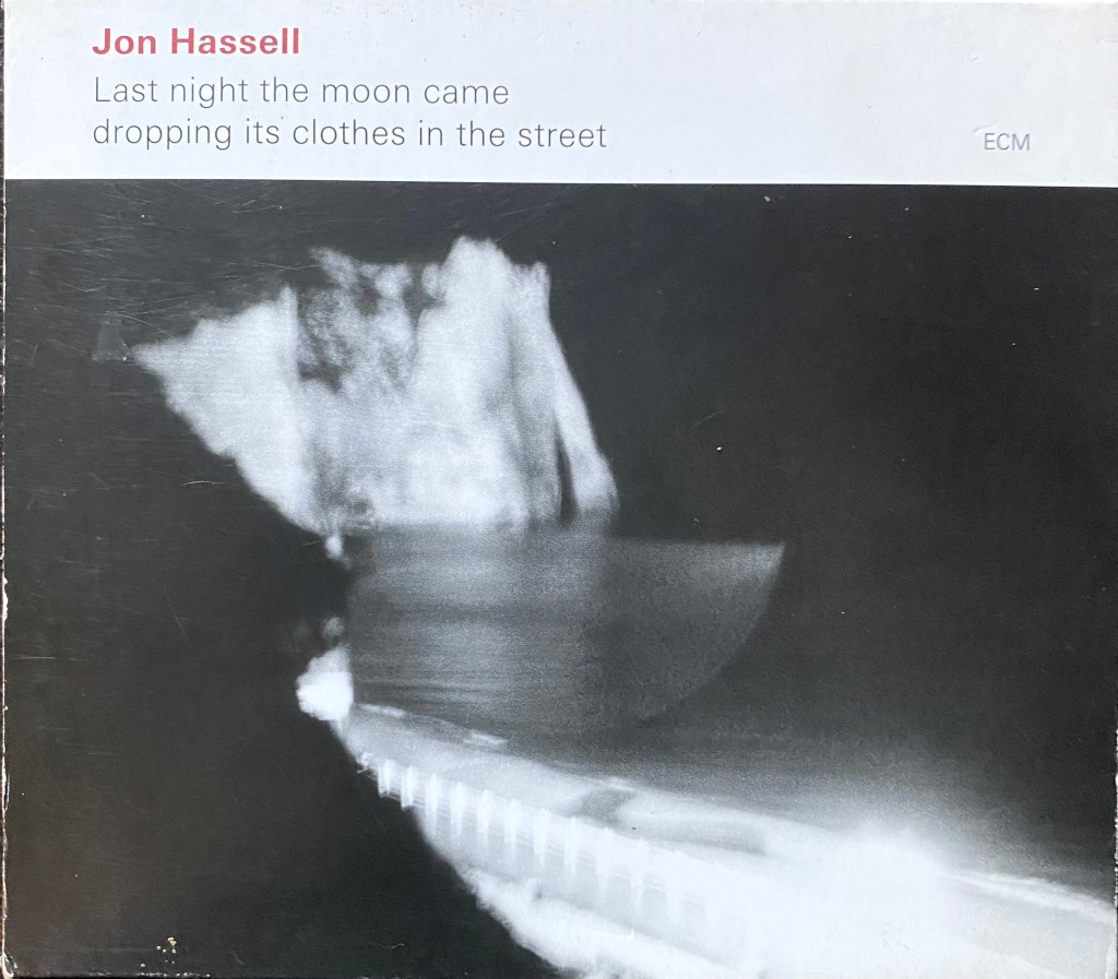 Hassell’s innovations and collaborations have produced some extraordinary recordings. My personnel favourite is his ECM recording ‘Last night the moon came, dropping its clothes on the street’ (the title is from a Rumi poem). On this album from 2009, he plays alongside like-minded Norwegian improvising musicians. He always used evocative album titles and his album covers and videos magnify the effect. Album titles like ‘Vernal Equinox’, ‘Dream Theory Malaysia’, ‘The Surgeon of the Night Sky Restores Dead Things by the Power of Sound’, ‘Mareefa Street, Magic Realism’,’ Listening to Pictures’, ‘Seeing through Sound – Pentimento’ (pentimento: where a painting reveals fragments of an older painting hidden underneath). He painted in the softest of pastels, dabbing sound onto a universal canvas, elevating mood to the position of supremacy and infusing everything with a rare beauty.