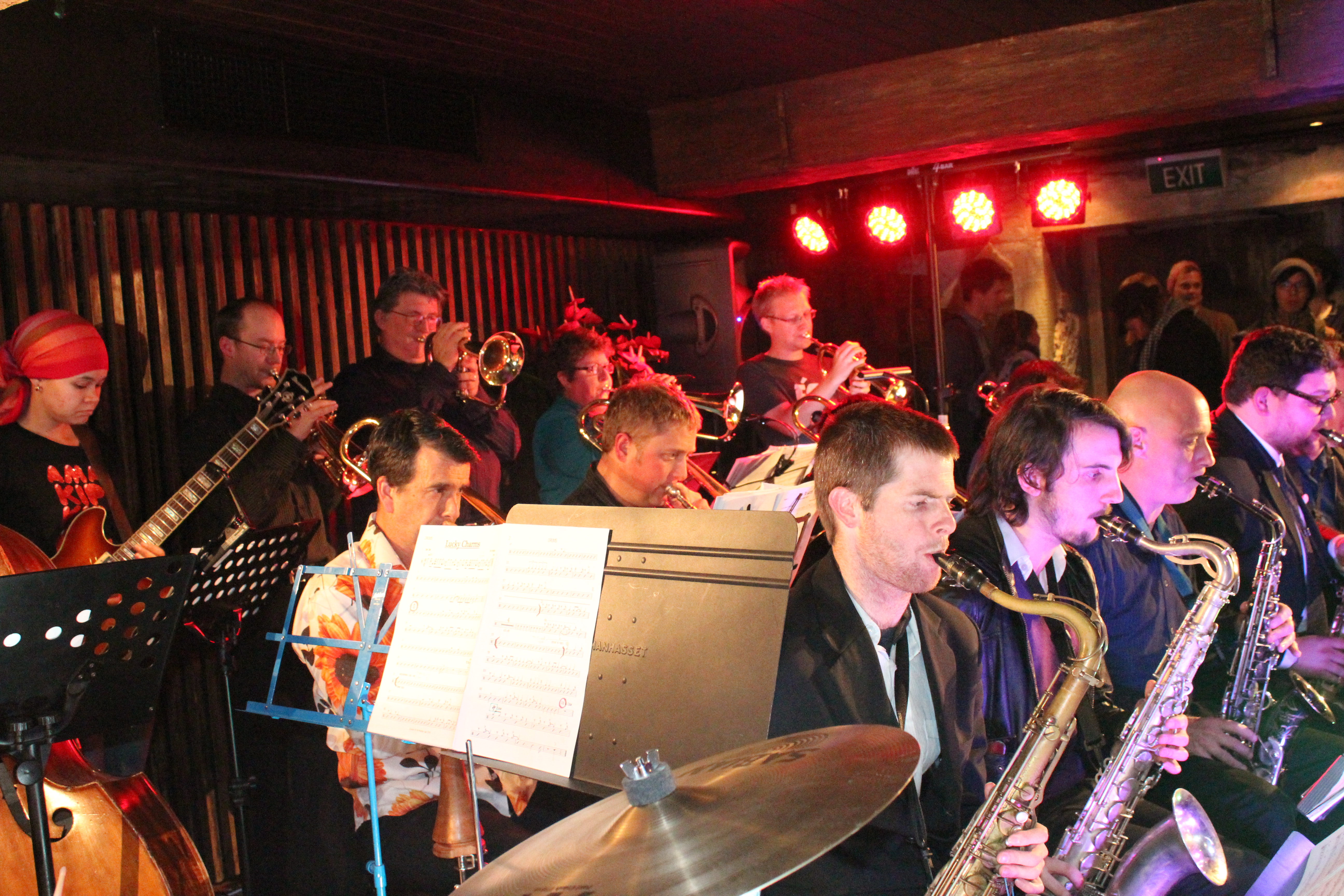 The band is: Alto saxes – Steve Sherriff, Theo Clearwater, Tenor saxes – Jimmy Garden , Andrew Hall; Bari Alex Churchill; Trombones – Merv Thomas, Mike Ashton, Mike Young, Steve Taylor; Trumpets – Mike Booth, Rowan Bolley, Jo Spiers, Pete Barwick; Drums – Cameron Sangster; Bass – Thomas Botting; Guitar – Andrea Groenewald; Piano – Adam Fuhr.