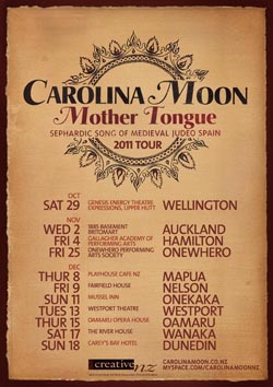 Carolina’s wonderful album ‘Mother Tongue’ is beguiling and all it takes is a single listen, for the mysterious beauty of this ancient music to stay with you forever.   This album speaks of medieval Spanish Sephardic culture with absolute authority and in partaking of the journey we are connected to a time and place most New Zealanders know little about.