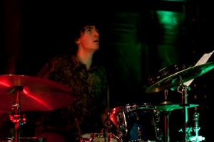 Cam Allen usually plays alto but he is also a fine tenor player.   I have also seen him manipulate a Moog to great effect.  On Wednesday night he played a Buescher ‘Big B’ Aristocrat and it gave out an earthy, and slightly raspy sound.  Word has it that it is a tricky beast to play but it sounded just right for this gig.   I risk committing heresy here but a Selmer would have been too clean for this music.  His interesting modal explorations and his flow of ideas mark him out as a gifted player.  This is hardly surprising as he honed his craft on the highly competitive American Jazz scene.  In this band he doubled on ‘doogon’.   This is very much a ‘Kiwi’ thing and it is best described as an array of electronic and acoustic sound enhancements strapped to a hardware-store hand truck.  Resembling a cross between a Dalek and an IED with its glowing blue lights, digital clock console and multiple knobs (many strapped on with duct tape); it can envelop the audience with shrieks that resemble a Banshee at a rocket launch.  IMG_8075 - Version 2