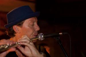 Tim Sellars is a drummer/percussionist who graduated from Canterbury University Jazz School with honours.  His studies led him to examine the rhythms and tunes of middle eastern music and he put together ‘Mukhlisa’ to further these explorations.  The Auckland line up features two artists who we are very familiar with, Glen Wagstaff on acoustic guitar and Tamara Smith on flutes.  For leader Tim Sellars, and for bassist Michael Story this was a first visit to the CJC.  Of the tunes chosen many were traditional but the largest number were by a modern writer of Middle Eastern music Joseph Tawadros.  His compositions fuse the traditional with Jazz and allow ample room for improvisation. CJC Feb 5 2014 061Watching Tim Sellars on percussion is eye-opening as he coaxes so many complex rhythms and sounds from his array of percussion instruments, that it beggars belief.  At times he used the Cajon (of African/Peruvian origin) but mostly he played frame drums (middle eastern). I love to hear the frame drum as it is the oldest instrument known to man. The genre includes the Riq (tambourine) which Tim played to perfection.  Being an amplified acoustic ensemble the sound worked well in the club space.  The guitar perhaps needed turning up a touch, to give it more bite. CJC Feb 5 2014 056Tamara was her usual impressive self and her control and mastery of the instrument was evident throughout.  She alternated between bass flute and alto flute; the tonal richness of both horns blending perfectly with the upright bass.  Bass player Michael Story understood the cues and worked with Tamara; resisting any impulse to overplay. Acoustic ensembles like this require discipline and subtlety; overly showy solos can dominate and obscure the filigree of woven sound.  Mukhlisa got that right and the solo work although appealing, was rightly subordinate to the overall integrity of the music. Glen Wagstaff is popular in Auckland and his charts for large ensembles have impressed club goers.  It was good to see him in a different context and many of us  eagerly await his album, which is due out in a month or so.