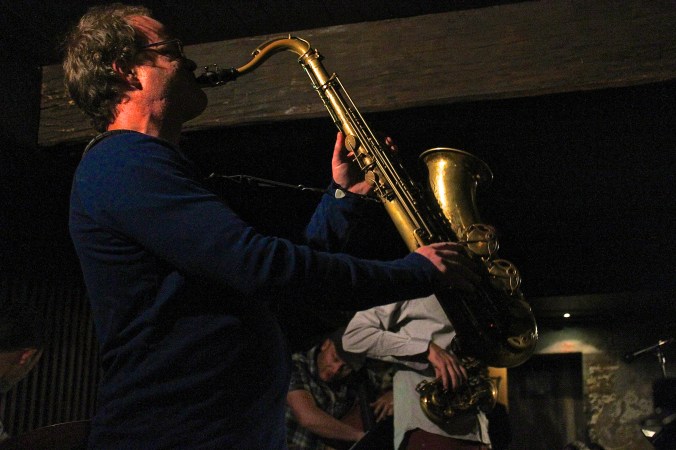 All of the instruments including the drums feed into this machine and the effects are astounding.  On upright bass was the respected Tom Dennison who used his arco technique to very good effect.  This bowing worked well with the Doogon, which under Allen’s guidance resonated in ways that would have astounded the instruments makers.  Dennison has a lovely rich tone and we heard plenty of that.  What can never be overlooked are his compositional skills (See an earlier post on his ‘Zoo’ album).  For this gig he contributed the lovely ‘Eleanor’ which he dedicated to his girlfriend.  He seldom appears at the CJC these days and it was a pleasure to see him there again.