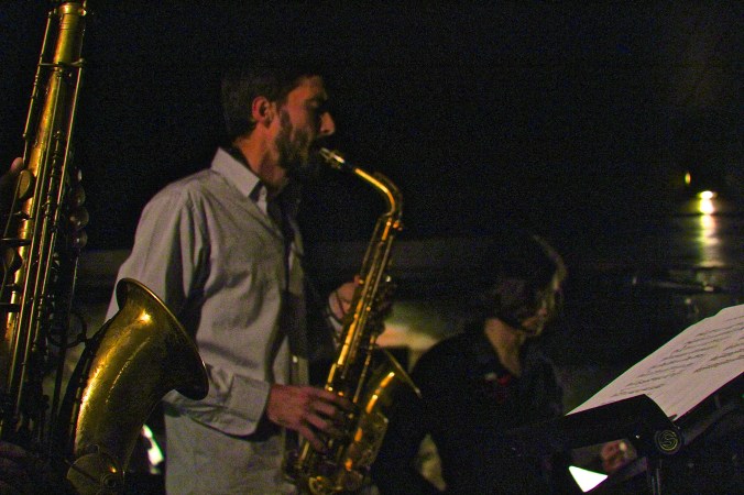 The band that fronted the CJC gig was the basic McNabb, Gibson, Hannan & Morton-Jones unit.   They got down to business and showed us that they did not need the extra instruments to create a big sound.   Murray had thrown a curve ball at Stephen by writing parts for two saxophones (to be played simultaneously) and Stephen in true Roland Kirk fashion had risen to the challenge.  I asked him after the gig if it had been daunting to play two saxophones at the same time and he admitted that he had needed to work hard in order to get there.   The fingering on a soprano and on an alto is the same, but a fourth apart.   This unison playing worked well and at times Stephen also used one of the instruments as a drone.   He joked afterwards that the biggest challenge would be playing counterpoint to himself.   Maybe that wasn’t a joke.