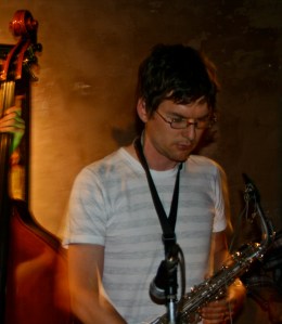 Louis McCallum played straight alto sax, clarinet and at times his alto sound was electronically altered by a small Korg analogue box.   Rather than choosing a modern synthesized saxophone he had purchased a $3 mini microphone and strapped it below the mouthpiece.    This simple approach produced interesting effects, but unlike the synthesized sax the effects can be turned off and on at will.    Using his clarinet in juxtaposition to Neil’s Fender gave ‘Lime House Blues’ the feel of being ultra modern while remaining respectful of a trusty old war-horse.  Louis also demonstrated an ability to deliver the BeBop and Post-Bop lines that some of the tunes called for.